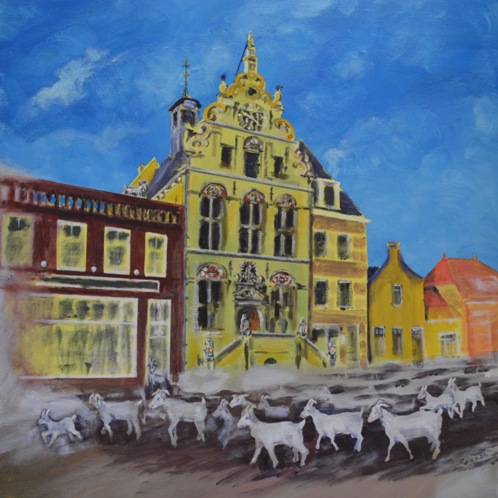 2021 Dies de Jonge Brouwershaven "geiten op de markt" acryl op canvas 70x70cm.